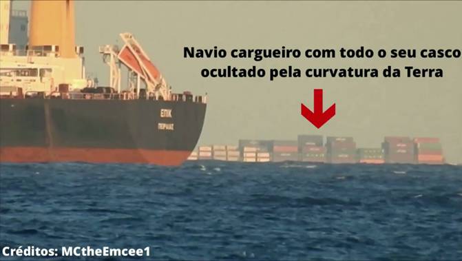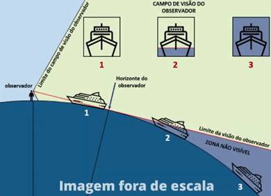 Note que há dois navios no horizonte, porém um deles está quase que completamente ocultado, aparecendo apenas as estruturas superiores do navio. Algo semelhante é observado na imagem seguinte, na qual há dois navios e um deles está quase que totalmente ocultado, aparecendo apenas os contêineres que carrega: