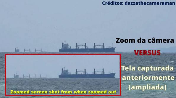 E isto é verdade! No entanto, nada prova com relação a uma suposta planicidade das águas, as quais acompanham o contorno da Terra pelas mesmas leis da Física que permitem um avião fazer o mesmo, sendo a principal delas a força da gravidade, que também é questionada pelos terraplanistas, como será visto no final. O que o experimento demonstra é apenas que nosso olho não enxerga o que a câmera consegue ampliar. Antes mesmo do zoom máximo, nota-se nas imagens apresentadas que o barco ainda não tinha ultrapassado a linha do horizonte na qual a curvatura da Terra o faria sumir definitivamente. Veja: