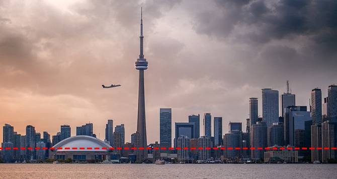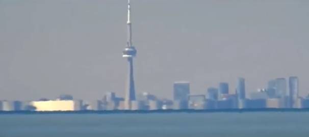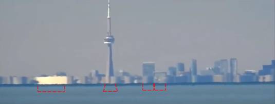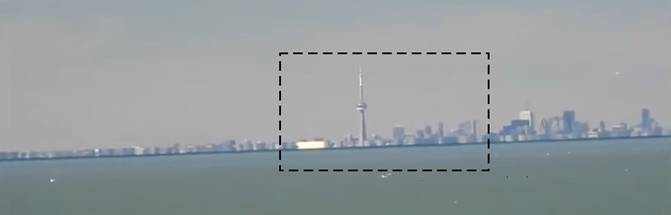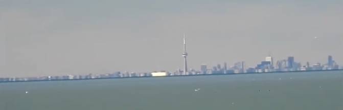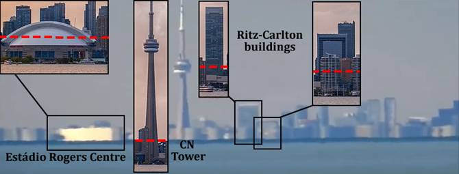 Observe que os prédios menores estão quase totalmente escondidos pelo horizonte. Apenas os maiores estão aparecendo de maneira mais proeminente, como é o caso das torres do Ritz-Carlton e da própria CN Tower, que está menor do que realmente ela é. E do estádio Rogers Centre só se vê o teto branco, provavelmente com efeito de difração.